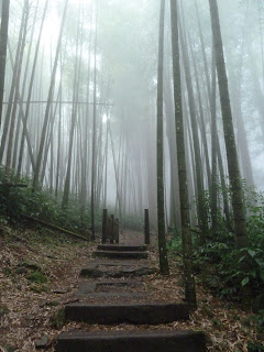回頭看是每天成長達廿一點九三公分,一暝大一尺,成長令人咋舌的孟宗竹林 ; 向前,陡直的石階通雲之道。